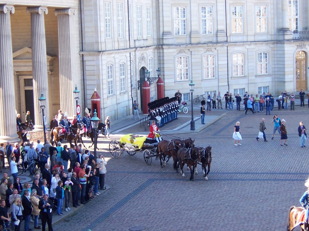 The hearse and escort entering the square of Amalienborg Castle in Copenhagen.